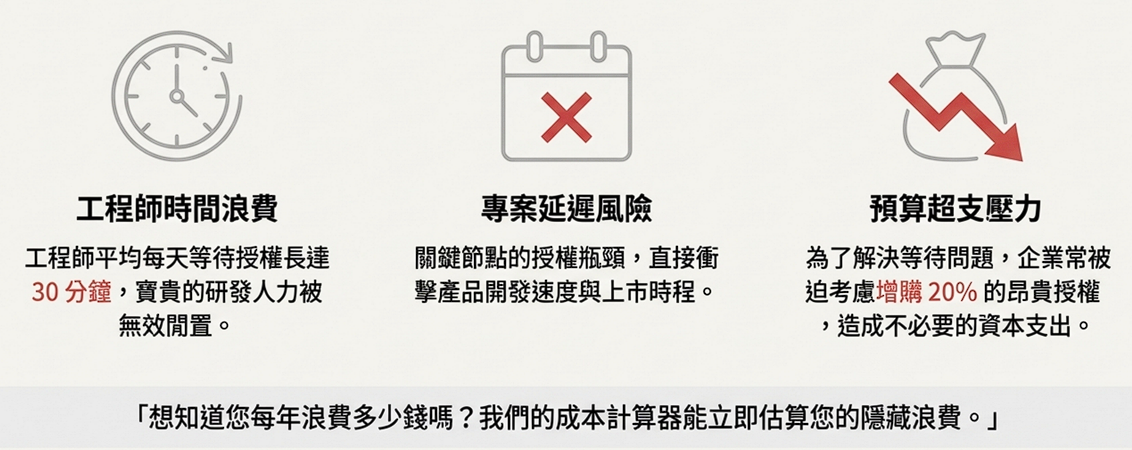 2025-12-08 OptiLIC 閒置授權智慧回收,加速研發軟體使用效率 文件下載 & 影音介紹 昂貴的CAD授權,為何總在關鍵時刻「授權不足」? 您的研發團隊是否也厭倦了排隊等待? 這不僅是日常的困擾, 更是侵蝕效率的開始。 傳統軟體管理方式, 已無法應對今日的研發節奏。 OptiLIC: 從「被動管理」到「主動優化」的智慧授權引擎, 獨家「閒置授權自動回收」技術,安全且高效 轉型實證: 台灣知名電子大廠如何節省500萬年度預算? 導入30天,成效立竿見影 詳細內容:連結 詳細內容查看